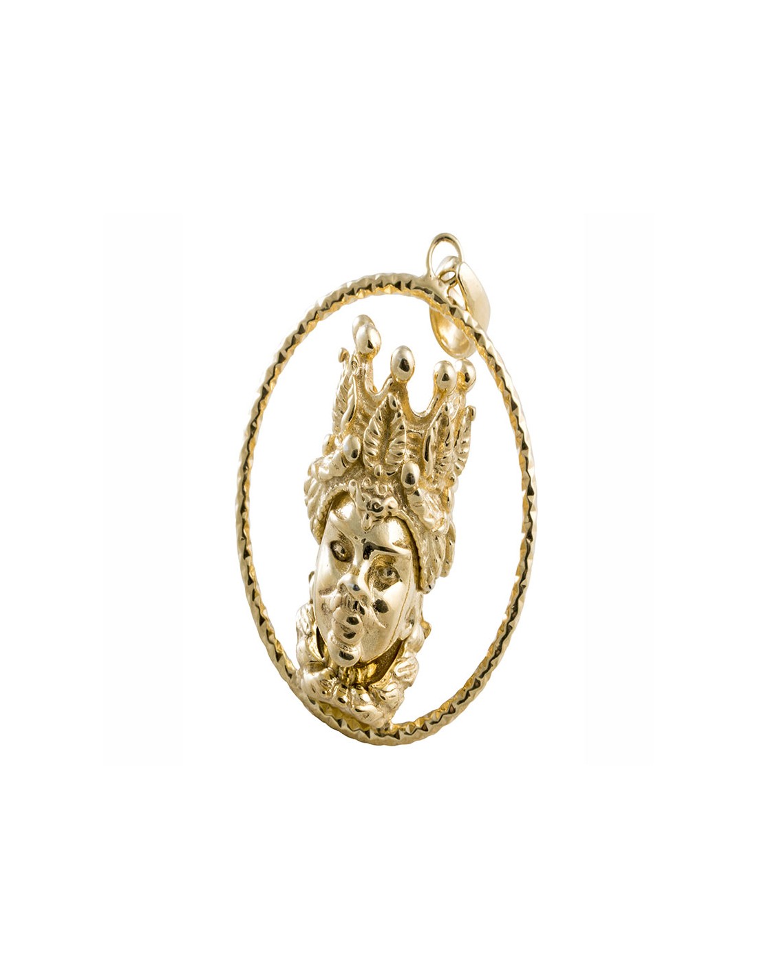 Pendente artigianale realizzato in argento 925 con galvanica in oro. E' un gioiello per donna dallo stile contemporaneo e dalla grande luminosità con una raffinata ed elegante Testa di Moro all'interno di un cerchio lavorato con maglie intrecciate.