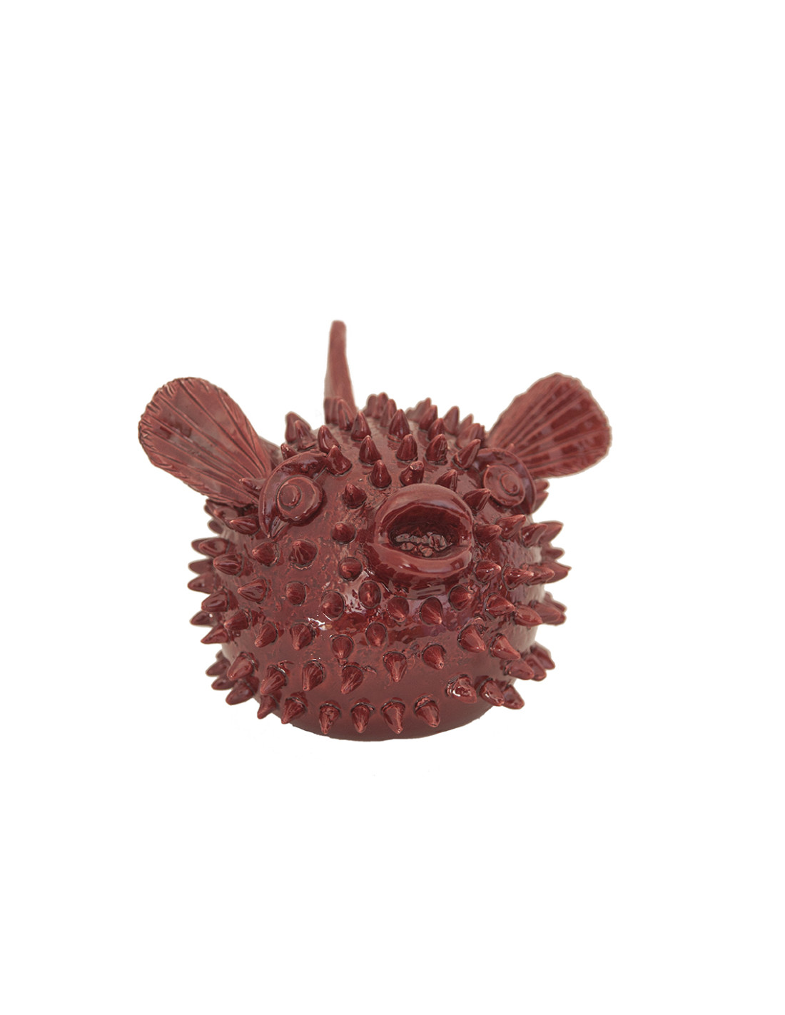 Pesce palla in ceramica di Caltagirone nella tonalità del bordeaux. E' una creazione artigianale Made in Italy modellata e decorata interamente a mano.