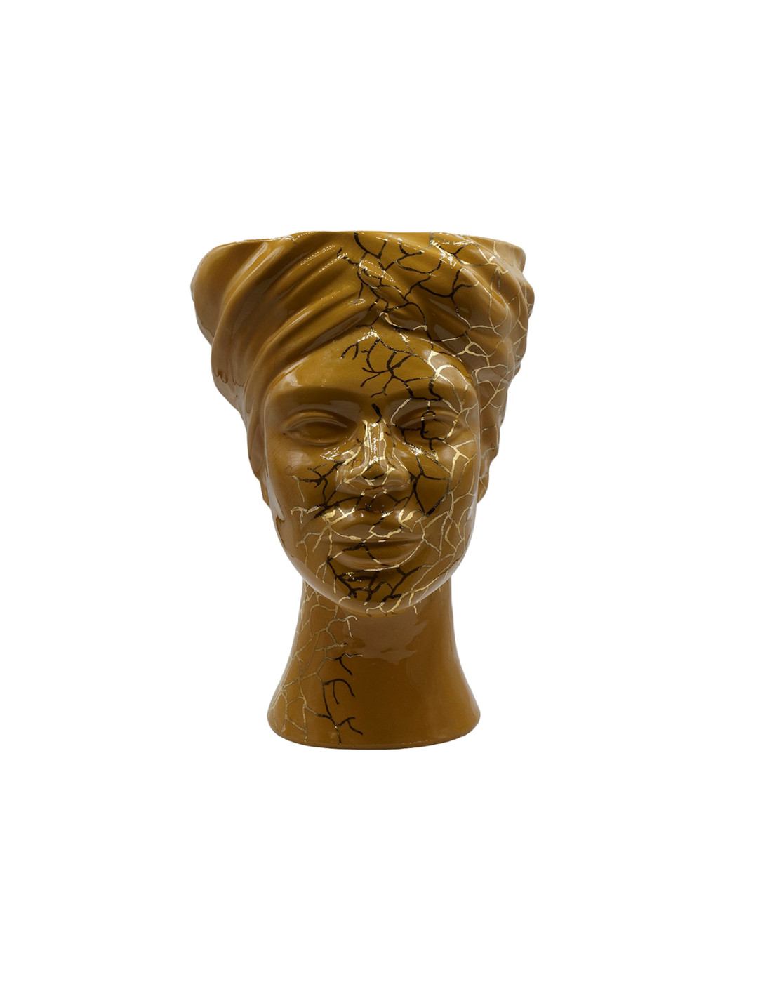 Testa di Moro della collezione Iride in ceramica di Caltagirone. E' una creazione Made in Sicily realizzata e decorata interamente a mano. Il viso è in argilla ocra mentre i dettagli sono in oro.