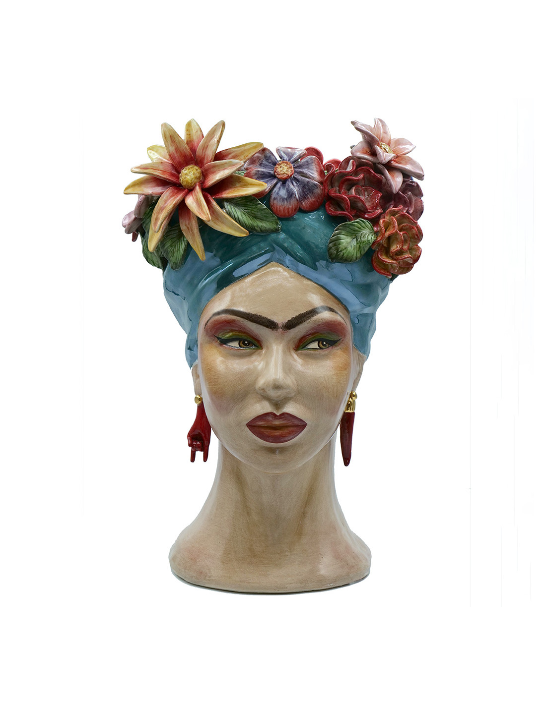 Testa di Moro della collezione Verus by Cori Amenta che nasce come omaggio a una vera e propria icona mondiale: la pittrice e artista messicana Frida Khalo. Forgiata e realizzata interamente a mano è una testa con il volto trucco, il turbante verde ottanio e i fiori colorati.